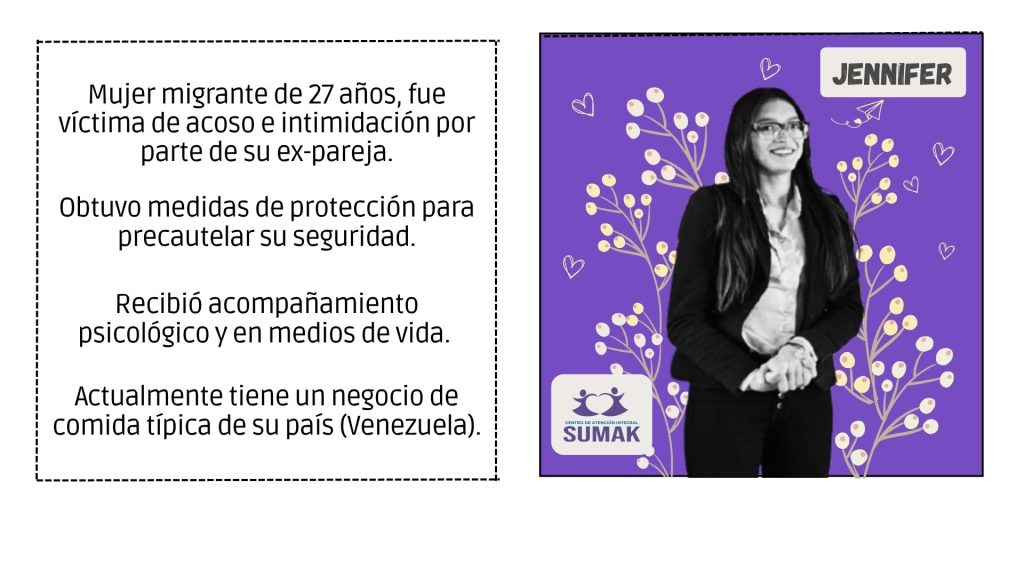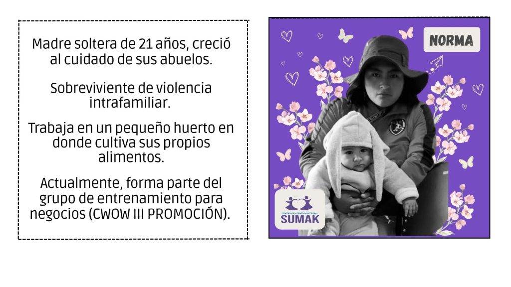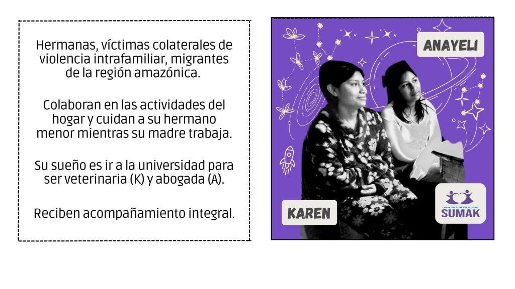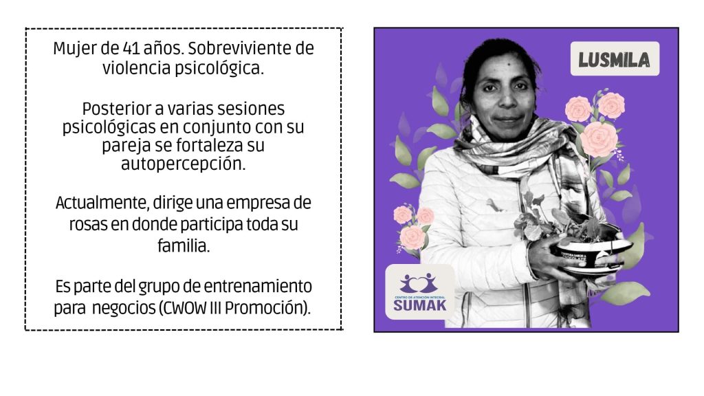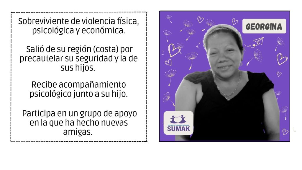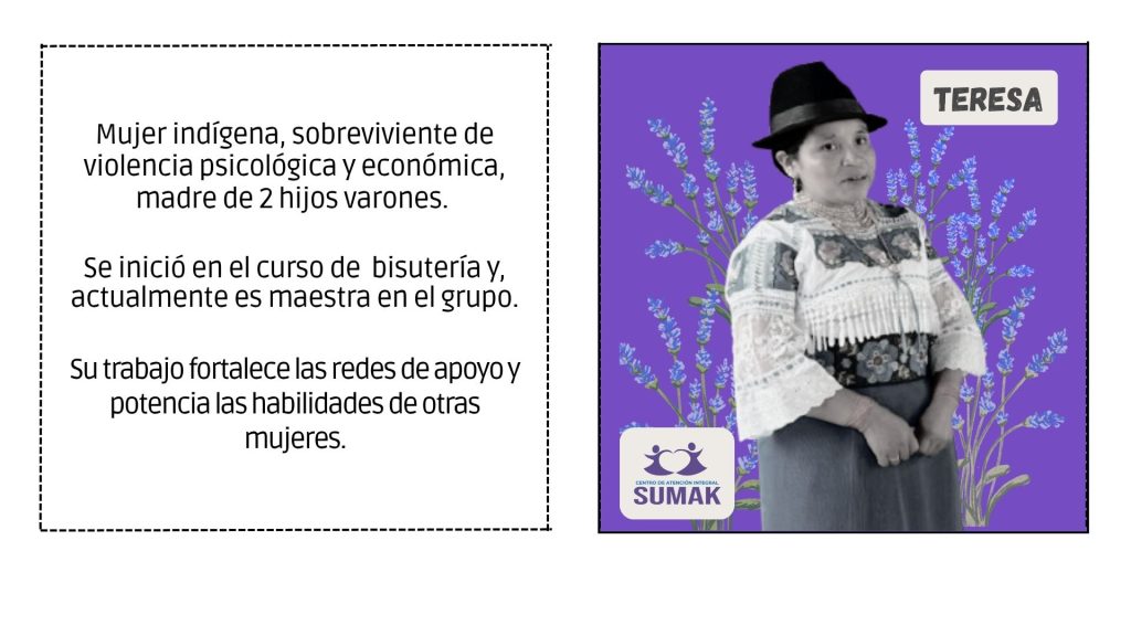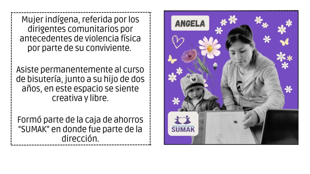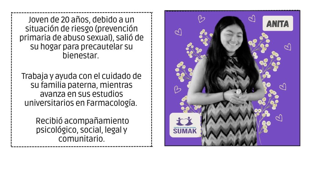 SUMAK ofrece atención especializada a mujeres, adolescentes y familias que han vivido situaciones de violencia. Brinda acompañamiento psicológico, legal y social, así como acciones de protección y empoderamiento personal. Su objetivo es garantizar una atención digna, segura y confidencial que favorezca procesos de reparación emocional y reconstrucción de proyectos de vida libres de violencia.